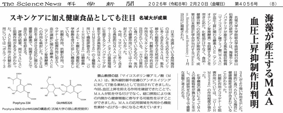 研究内容が科学新聞で紹介されました。 2026年2月24日 最終更新日時 : 2026年2月24日 kageyama マイコスポリン様アミノ酸(MAA)についての研究成果が科学新聞で取り上げられました。科学新聞 2026年2月20日(金)「海藻が産生するMAA 血圧上昇抑制作用判明」 この記事は科学新聞社の許諾を得て転載しています 。