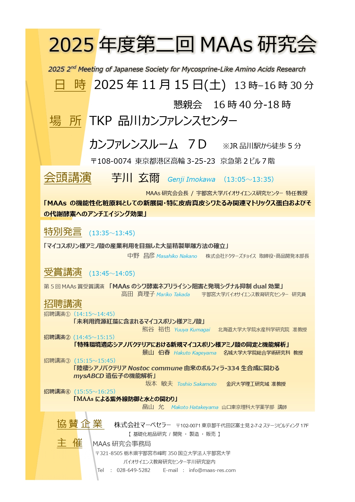 MAAs研究会に参加しました。 2025年11月17日 最終更新日時 : 2025年11月17日 kageyama 2025年11月15日、第2回MAAs研究会に参加しました。「特殊環境適応シアノバクテリアにおける新規マイコスポリン様アミノ酸の同定と機能解析」のタイトルで景山伯春教授が発表しました。