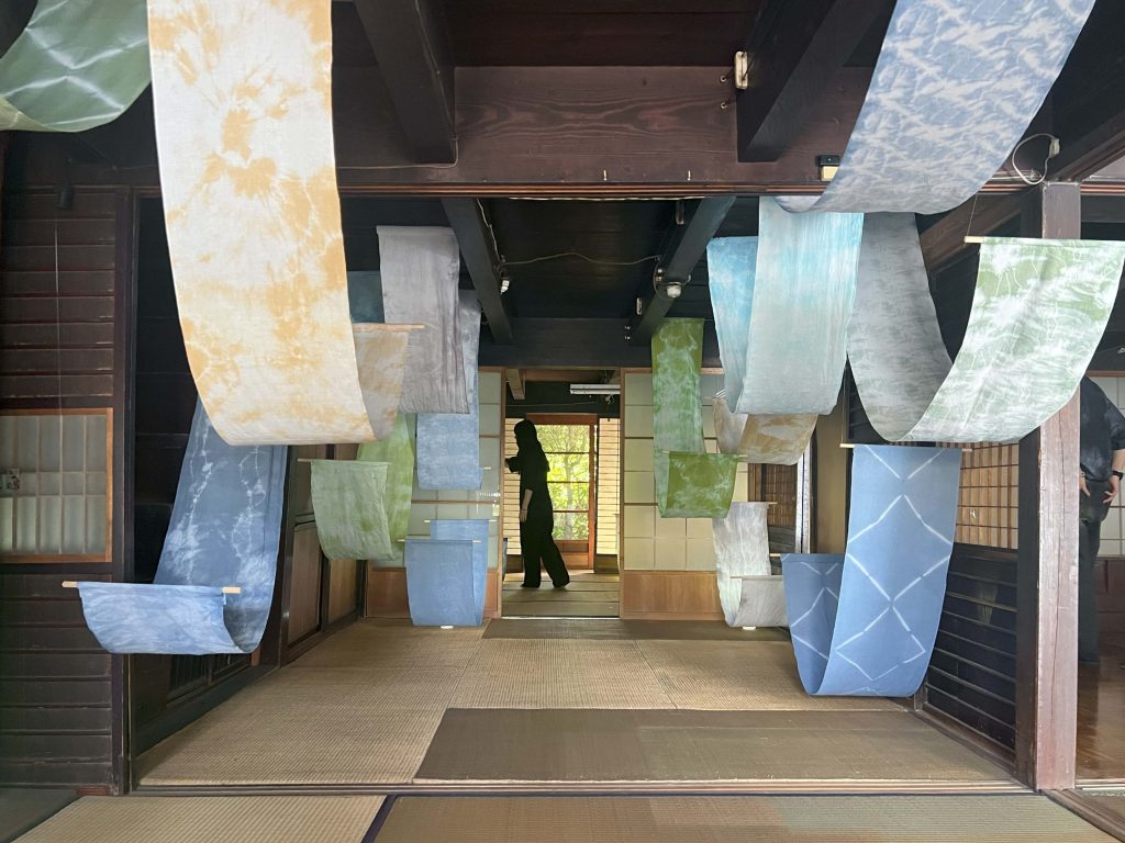 今回のイベントでは、学生たちが御油の松並木をイメージして制作した、布によるインスタレーション作品を展示しました。子どもたちがワークショップで鮮やかに染め上げた布も作品に取り入れられ、来場者の目を楽しませました。
