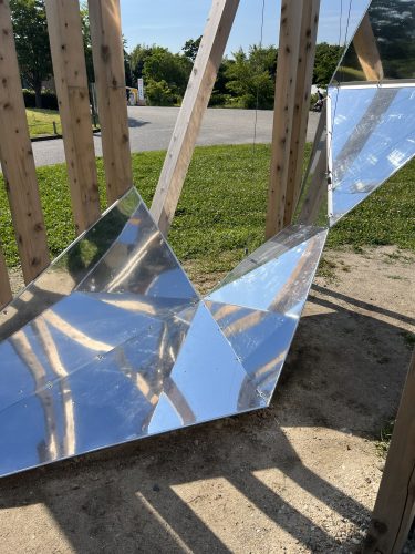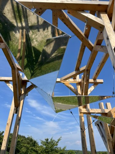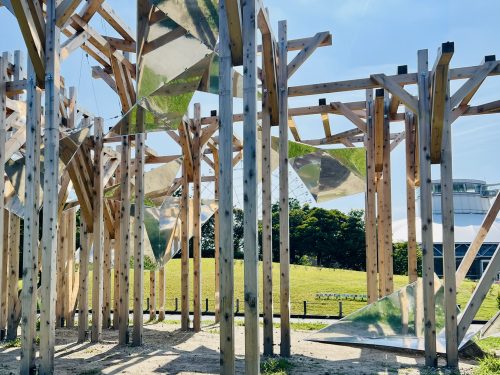 生田研メンバーの作品はミラーパネルに対して、空や草、フレーム、人など様々な要素が複雑に映り込み、その間を探索的に歩いていただくという内容。テーマ説明は下記の通りです。