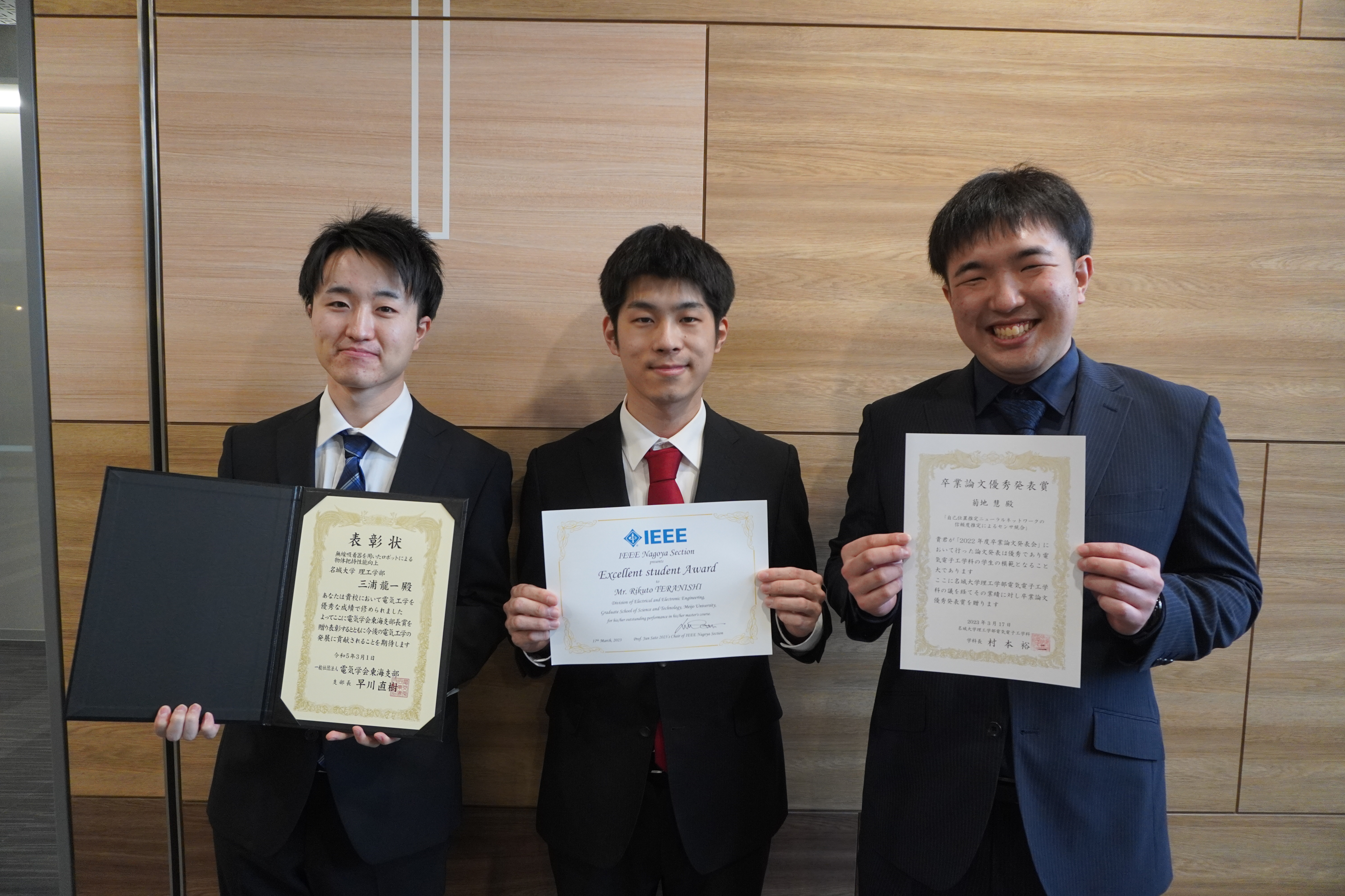 三浦君は大学での成績をたたえられ、電気学会東海支部長賞を受賞しました。寺西君と菊地君は修論、卒論の発表が認められ、それぞれIEEE Nagoya Section Excellent student Award、卒業論文優秀発表賞を受賞しました。おめでとうございます!
